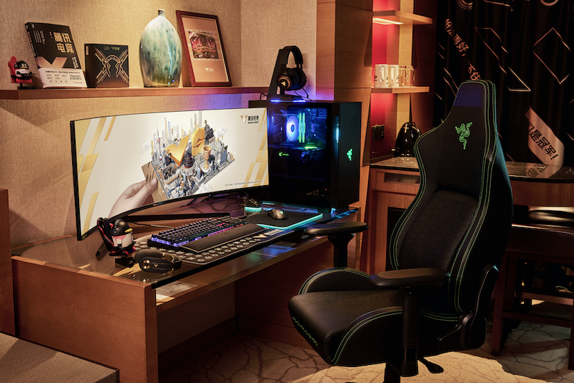其中,腾讯电竞主题房以黑色和金色为主色调,房内设有SKG按摩仪、RAZER雷蛇提供的全套电竞设备搭配幻彩RGB灯光,提升炫酷感官和沉浸式的游戏体验。