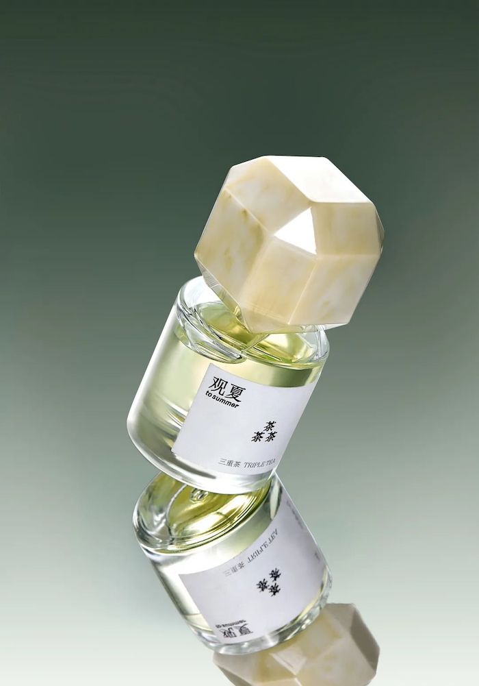 6 月初,创立于2019 年的东方新摩登生活方式品牌观夏发布了首支东方精粹系列香水「三重茶」,该系列香水的气味、设计概念灵感均来自于东方庭院美学。不同于西方的「甜茶」,有「苦、甘、醇」三重茶味。此外,香水的瓶身设计的灵感来源于江南庭院独有的八棱花窗,手工打磨,拥有东方建筑的美感。该系列还包括有昆仑煮雪、溺海之橙和玫瑰烧。