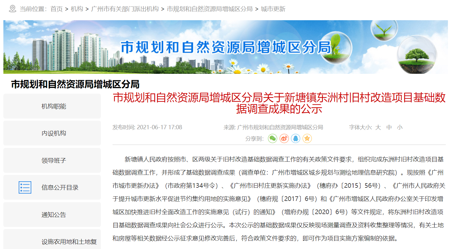 6月17日,市规划和自然资源局增城区分局发布了一则关于新塘镇东洲村旧村改造项目基础数据调查成果的公示。