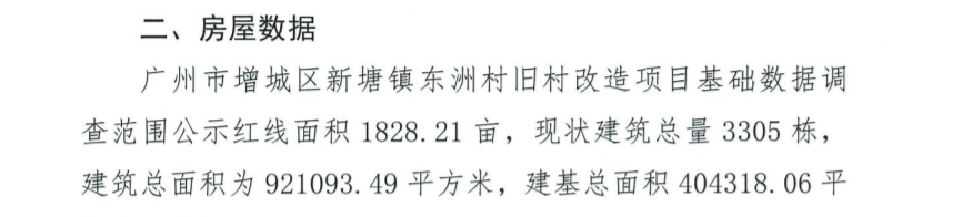 根据公示内容,新塘镇东洲村旧改项目户籍2124户,共5745人,调查公示红线面积为1828.21亩,现状建筑总量为3305栋,建筑总面积为921093.49㎡,建基总面积为404318.06㎡。