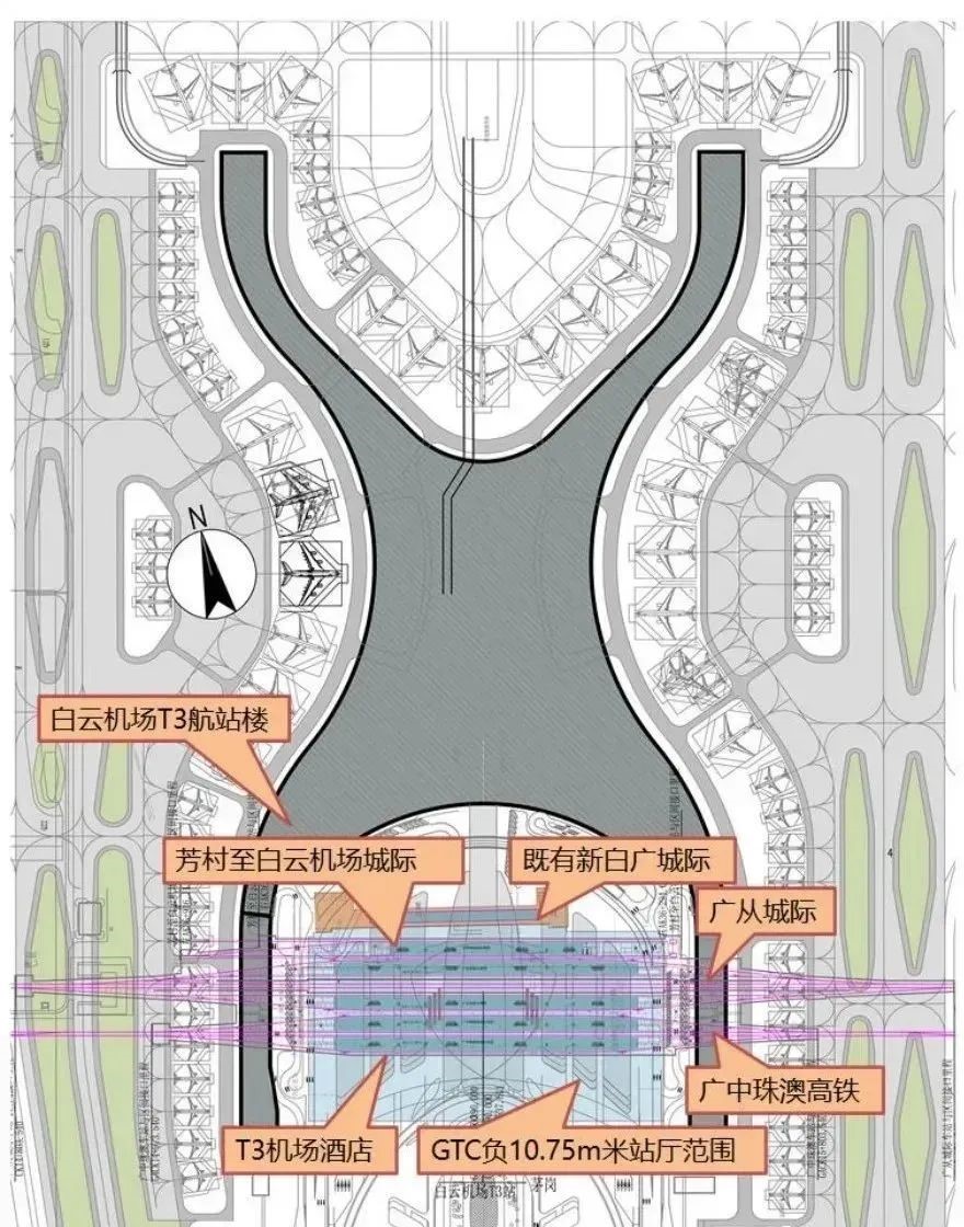 最值得一提的是,此工程将会打造成为空铁联运交通枢纽。据了解,该工程将引入广州至珠海(澳门)高铁、广从城际(广河高铁)、芳村至白云机场城际等线路,包括车站主体和机场红线范围内车站两端区间的预留土建工程。