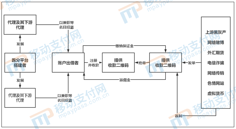 “跑分”是指:利用自己的收款码,为别人进行代收款,随后赚取佣金。具体流程是:用户提供收款二维码给跑分平台,同时给跑分平台缴纳一定的保证金。跑分平台利用这些收款二维码进行收款,每当用户的支付账户收到一笔款项时,对应缴纳的保证金就会相应减少,由此来完成一进一出的跑分行为,同时用户会得到一定比例的佣金。