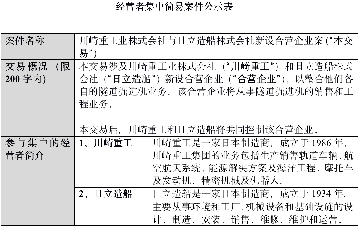 国家市场监督管理总局反垄断局6月17日晚间消息,川崎重工业株式会社与日立造船株式会社新设合营企业案进入公示期,时间为2021年6月18日至2021年6月27日。本次交易旨在整合他们各自的隧道掘进机业务,该合营企业将从事隧道掘进机的销售和工程业务。本交易后,川崎重工和日立造船将共同控制该合营企业。