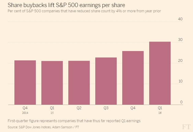 企业盈利下降,美股却依然上涨,主要原因是企业回购增加。因美元走强以及全球增长疲弱,企业营收受到冲击,美国企业一季度持续不断地回购股票,以支撑股价。