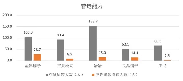 盐津铺子因销售渠道中大商超的销售占比较高,应收账款周转天数在行业中最高,2020年为29天,洽洽和良品铺子的应收账款周转天数在14-15天左右。而三只松鼠主要为线上销售,其应收账款周转天数8.94天。卫龙的应收账款周转天数在行业中是最少的,2020年仅为2.5天,意味着产品销售后;两天半就能回款,对下游的地位较强势。