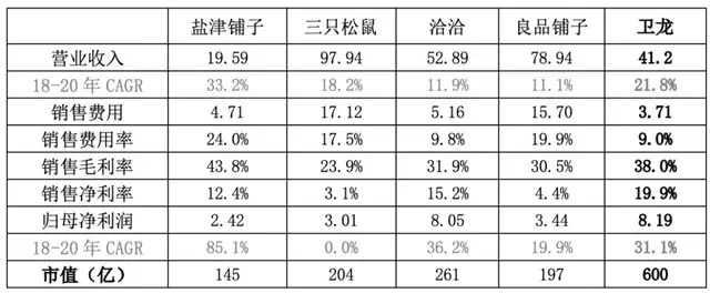 不难发现,卫龙的销售收入仅高于盐津铺子,营业收入不足三只松鼠的50%,由于公司的成本控制较好,销售费用最低,仅3.71亿,因此公司的毛利率和净利率相比同行业要高很多,净利率高达19.9%,可以看出公司的盈利能力较为优秀,卫龙的生意确实是个很好的生意。