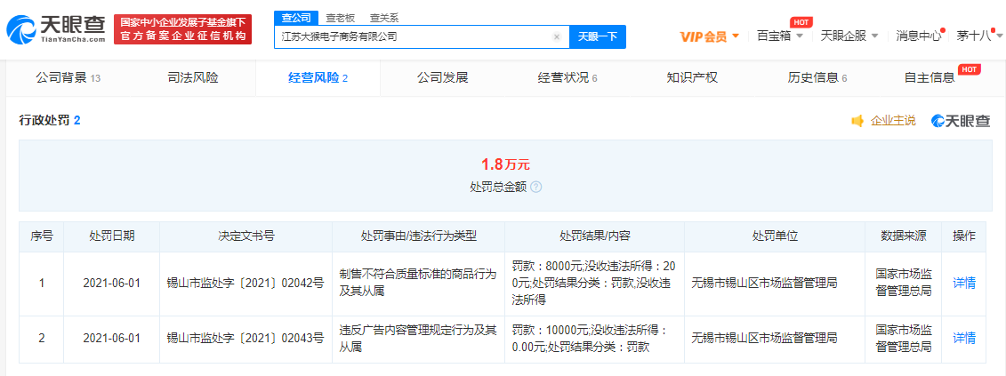 据天眼查APP显示,近日,雅迪关联公司江苏大猴电子商务有限公司新增两则行政处罚,违法行为类型分别为制售不符合质量标准的商品、违反广告内容管理规定,处罚总金额1.8万元,处罚单位均为无锡市锡山区市场监督管理局。