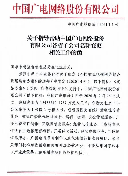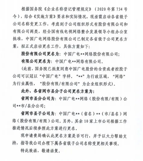 “统一名号”的工作率先开展,今年2月底,中国广电网络股份有限公司发布工作函,在全国范围内正式启动各省级子公司更名工作。按照工作函要求,各省网公司更名工作在2021年5月31日前完成,县级分子公司将在2021年6月30日前完成。从更名方案来看,如果是股份有限公司,更名为“中国广电××网络股份有限公司”;如果是有限公司,则更名为“中国广电××网络有限公司”。其余10家上市公司根据工作推进情况后续参照此方案进行更名。