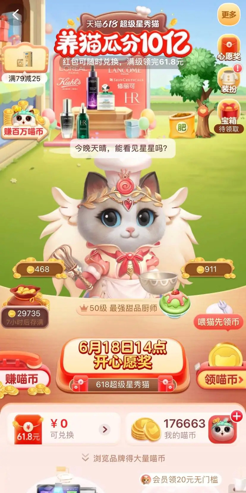 今年热度最高的,无疑还是天猫618的“养猫”。依然挂着“瓜分10亿”的标签,保持“等级越高分越多”的游戏规则,但平台这次明确了满级可获得的最高奖励数额:61.8元。也就是说,用户不用担心分红包的几率问题,只要你够努力,那笔钱就是你的。
