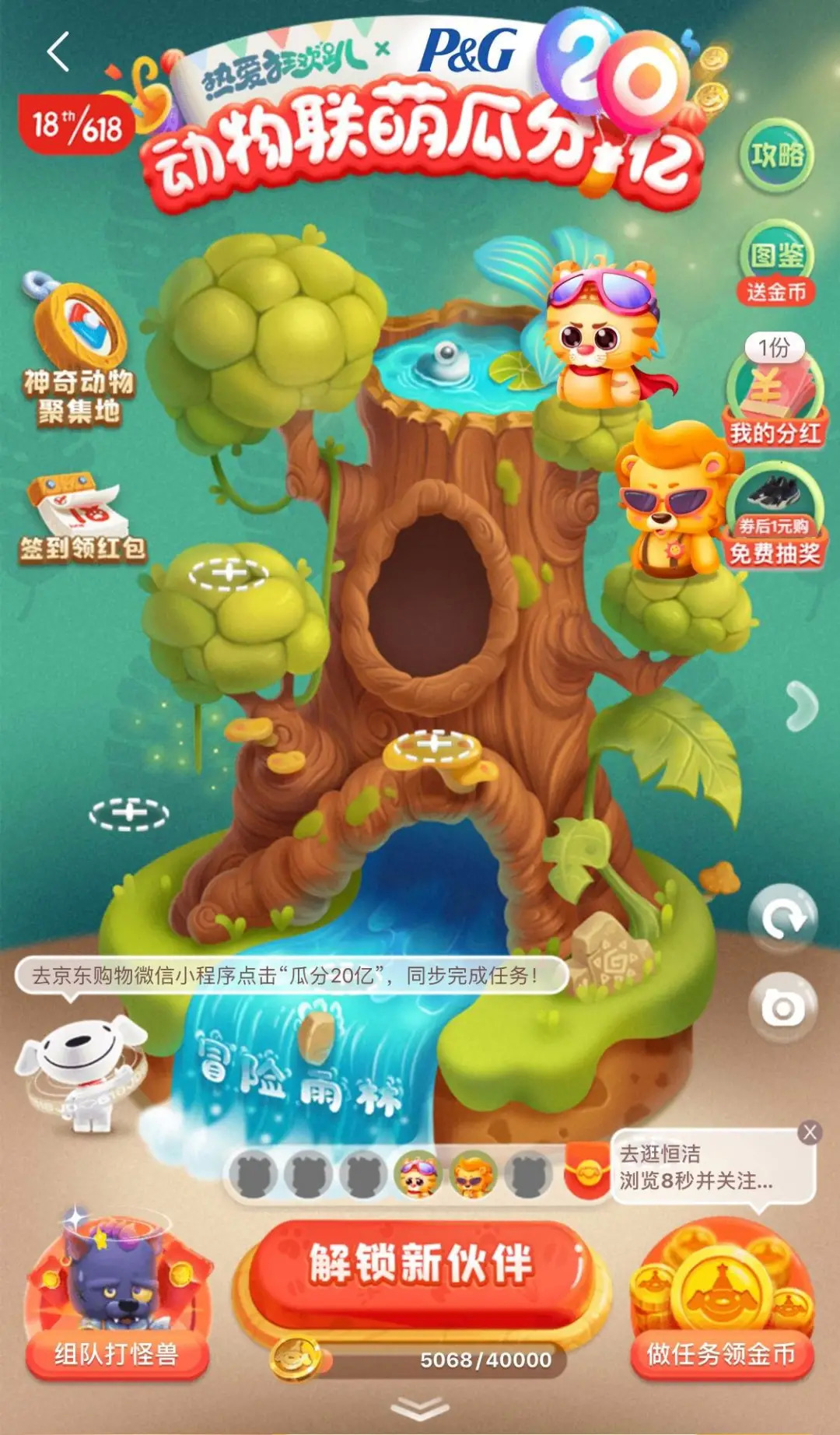 除了天猫618的“养猫瓜分10亿”,京东推出的“动物联盟瓜分20亿”,也是通过浏览商品和店铺、邀请好友助力等任务形式,不断解锁获取红包奖励。菜鸟裹裹也推出了“合成大包裹瓜分1个亿”的互动小游戏。