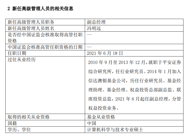 6月19日,信达澳银基金发布高管变更公告,6月18日起,冯明远出任该公司副总经理。