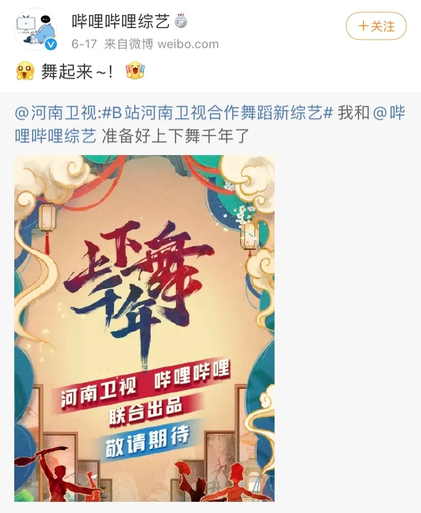毒眸关注到,国风内容丰富的B站和此前因为国风舞蹈节目频频出圈的河南卫视,在前几日官宣了合作的综艺节目《上下舞千年》,即中国主题的舞蹈竞演节目。