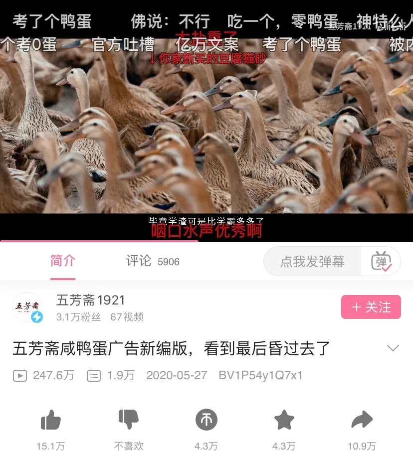 今年刚满一百周岁的五芳斋,就在B站十分活跃。2020年5月,五芳斋在B站发布咸鸭蛋创意广告,像纪录片一样展现原产地的画面,配上的却是“听奶奶的话,吃两个咸鸭蛋,然后走进考场,神挡杀神,佛挡杀佛”等魔性的台词。