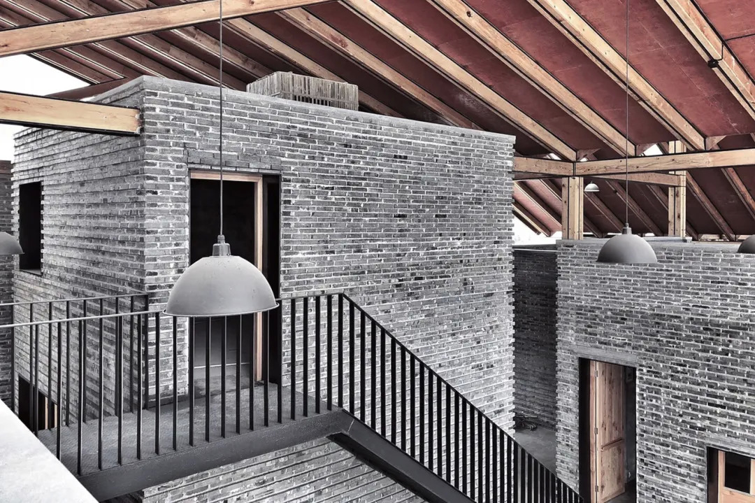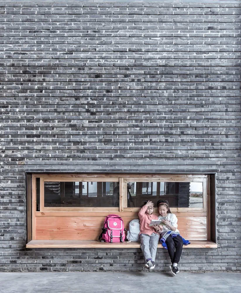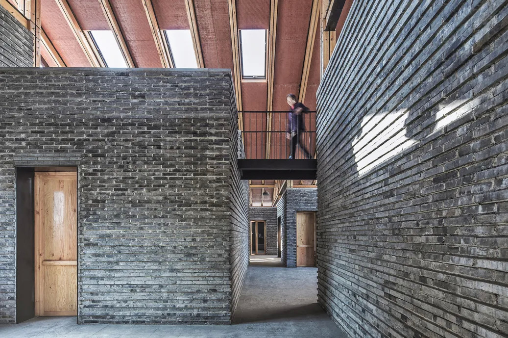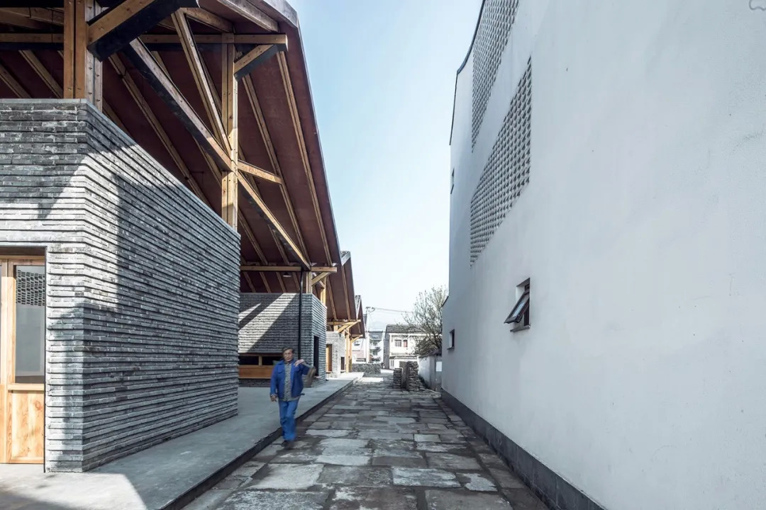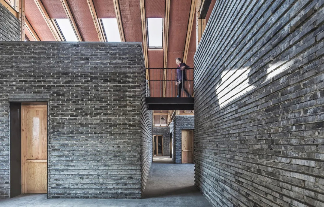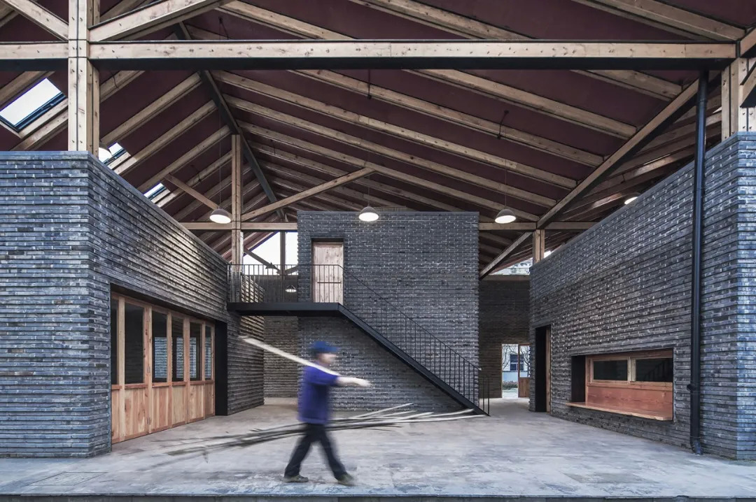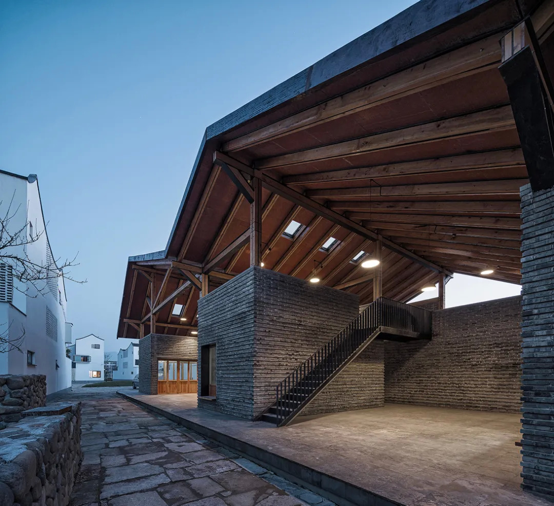 内外大量的青砖是建筑材质上的一大亮点,青砖墙体呈棱状凹凸排布,它们由当地村民亲手打磨,村民们的归属感就这样存储在每一块青砖里,建筑连接起人与人的情感。