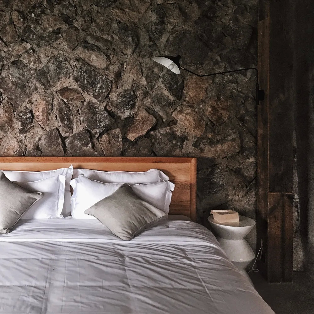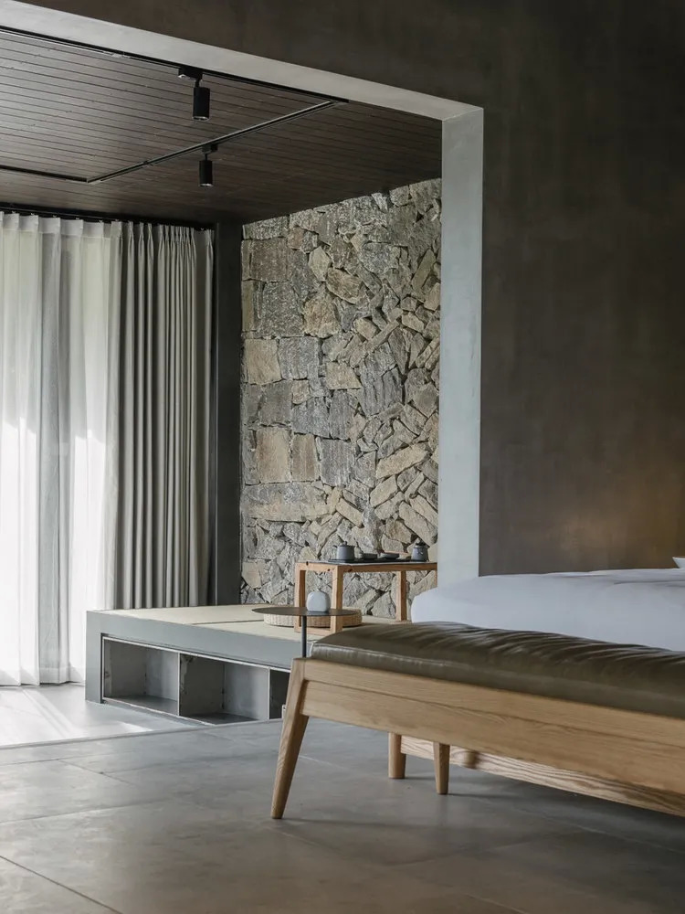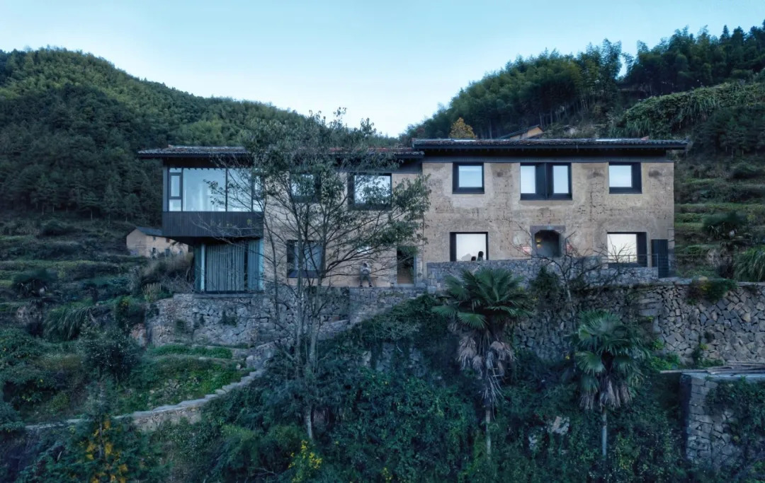 村中房屋大多在靠山的一侧采用毛石砌筑的护坡挡墙,这一点被运用到现代化的民宿里,反而成为设计亮点。