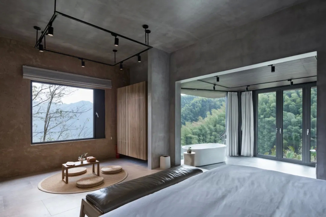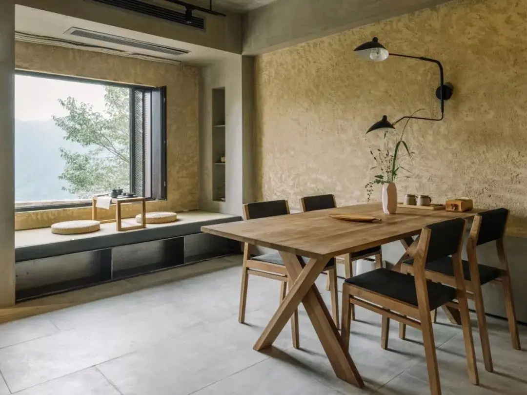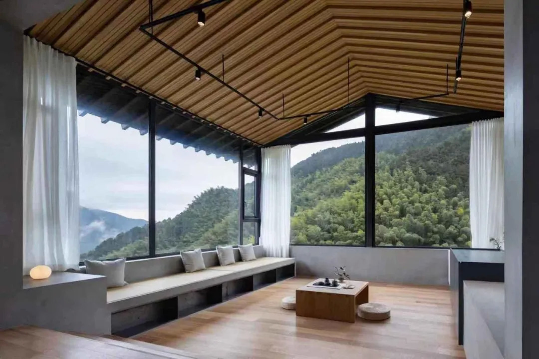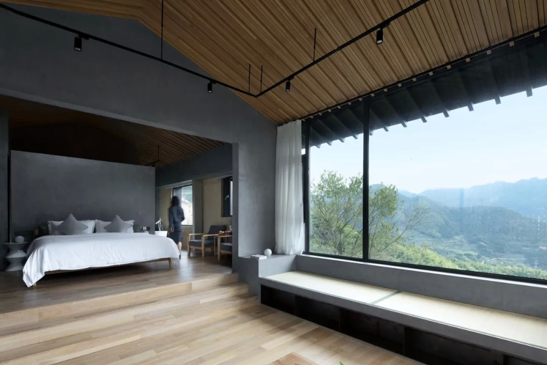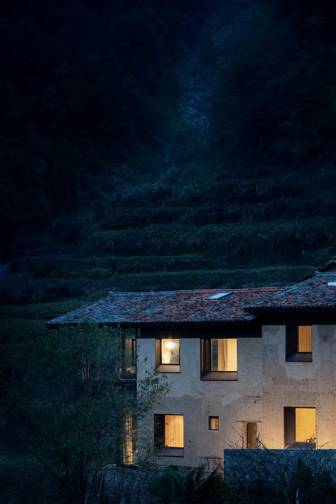 原有的门窗在保留形状的同时做了加大处理,允许更多山景进入室内成为墙上天然的画作。