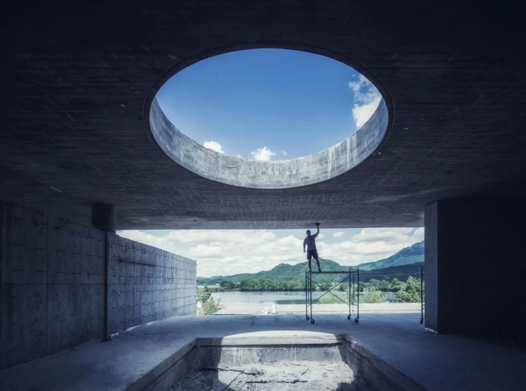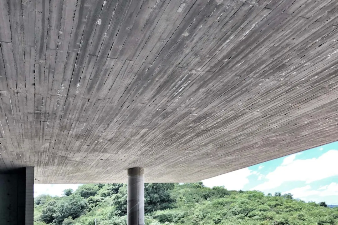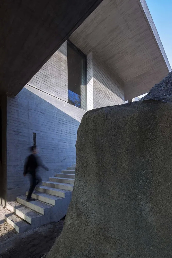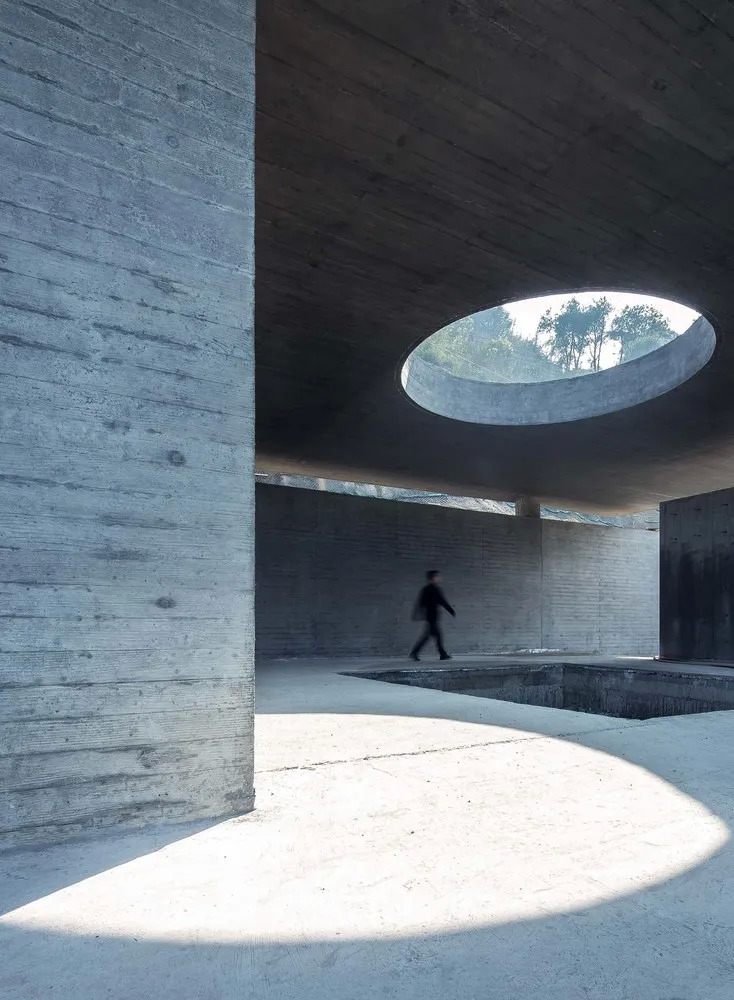 建筑材料最终采用了混凝土,对此设计师解释:作为一种在自然环境中介入感比较强的材料,能够与建筑整体谦和的体量策略达到一种平衡;而木模板特有的纹理又赋予了混凝土材料特殊的尺度和质感,能够弥补单一材料在趣味性上的缺失。