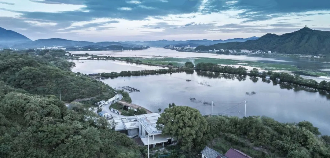 渔乡茶舍所在的地方是富春江、兰江、新安江三江交汇处,靠山面水,远观双塔,将开阔的山水之景拥在怀里。周边村庄建筑也都是青砖白墙,视觉清新质朴。