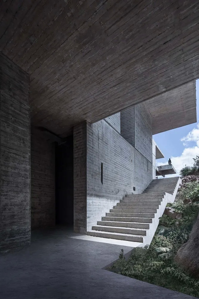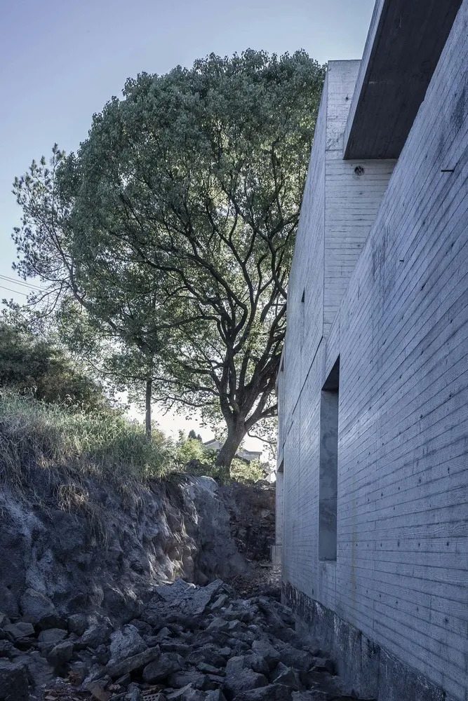 利用地形高差,主次两栋建筑贴合地形延展,逐层叠退,建筑就这样藏进小山坡里,又伸出来不少露台,用作赏风景的好地方。