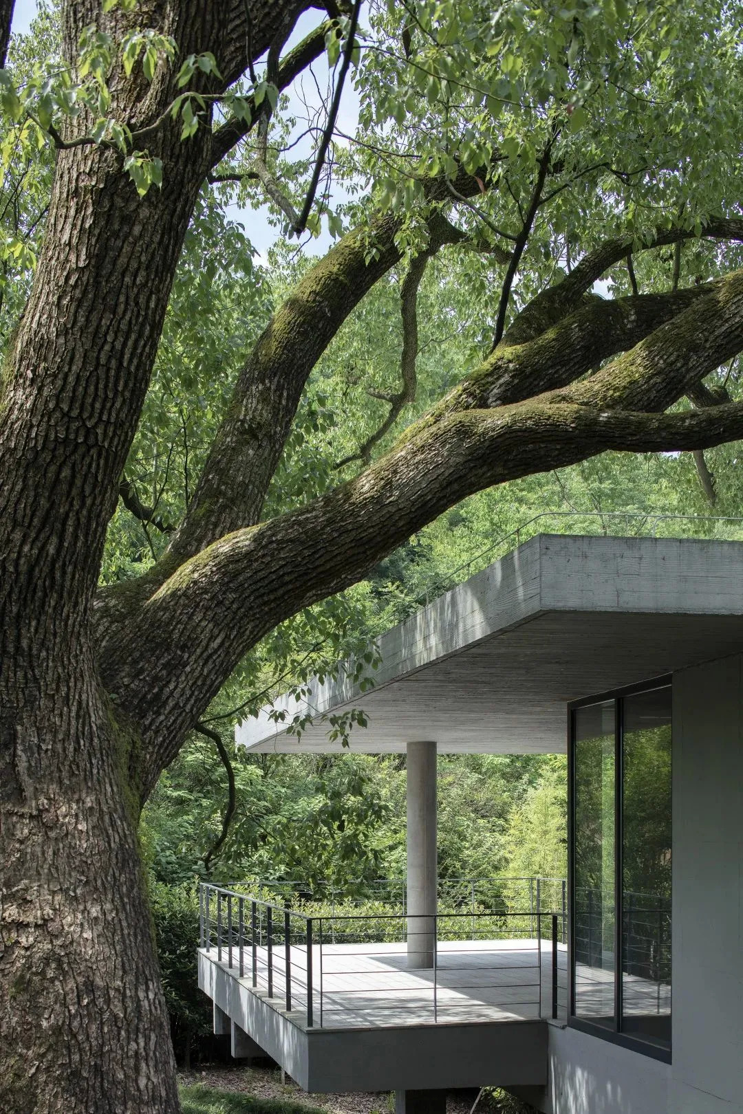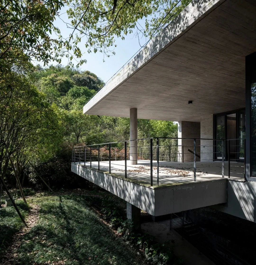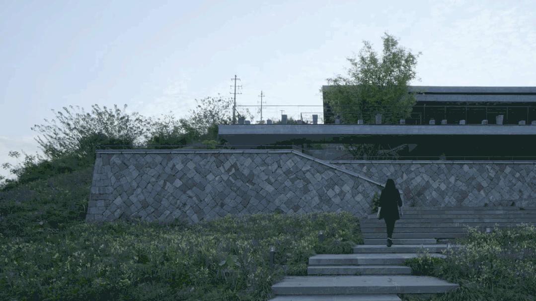 河边的入口处种有杉树,坡上的入口则是樟树指引,这些植物掩盖住建筑材料的突兀性,让游人自然而然地从山水过渡到建筑中,模糊着建筑与自然的边界。
