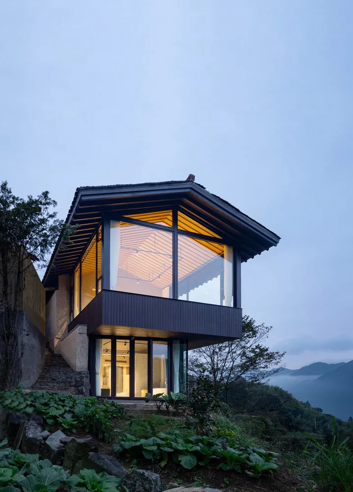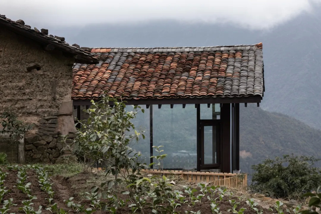 1 号楼的最西侧还有一个破败的柴房,孟凡浩和团队依照原有宅基地范围修建,还在二层新增了一个悬空挑出的玻璃空间,从室内延伸出去,全方位欣赏山中美景。
