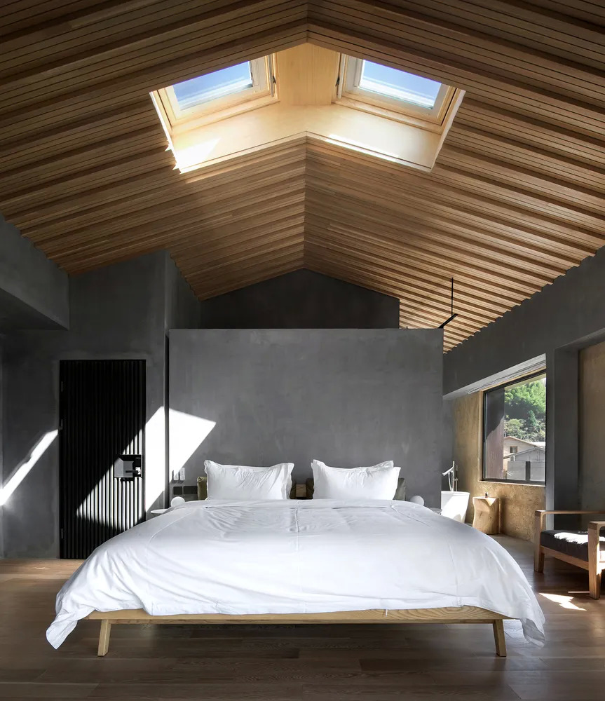 2 号楼的南侧靠着交通要道,出于隐私考虑,被规划成 loft 结构,一楼靠窗的位置有飘窗欣赏窗外山景,二楼三角形的屋顶开了天窗,让光照进室内,夜晚还可以躺在床上看山里的星星。