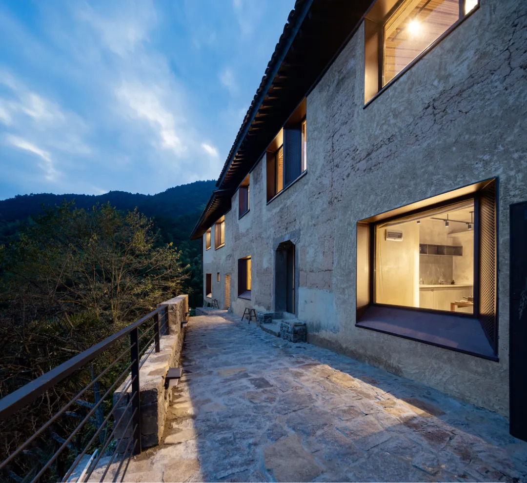1 号楼在村落尽头,面朝峡谷,景色极佳。上下两层均为客房,都是大落地窗,共赏同一面风景。外立面则保留了原始的夯土墙面,融于村落景致中。