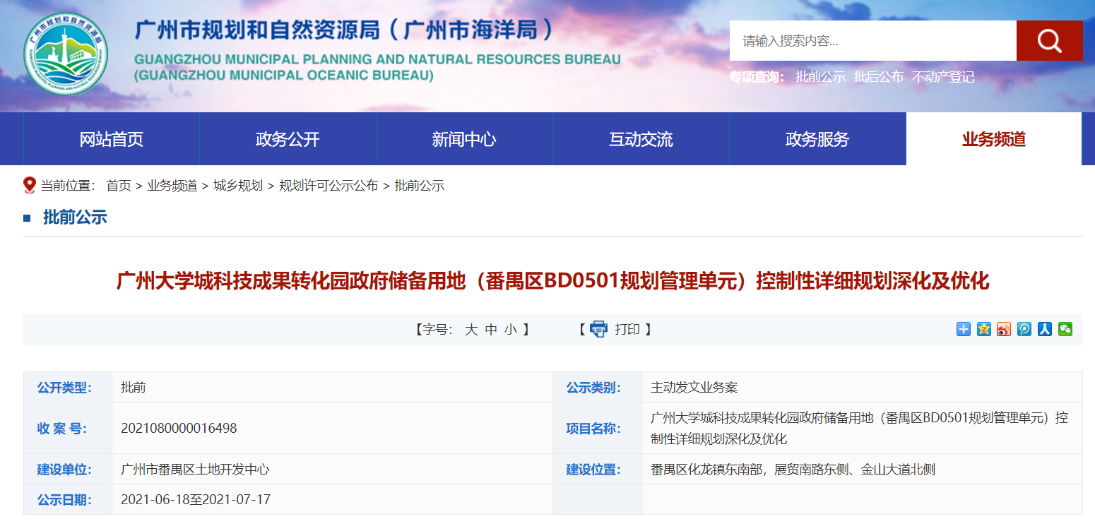6月18日,市规划和自然资源局发布了一则关于广州大学城科技成果转化园政府储备用地(番禺区BD0501规划管理单元)控制性详细规划深化及优化方案的批前公示。