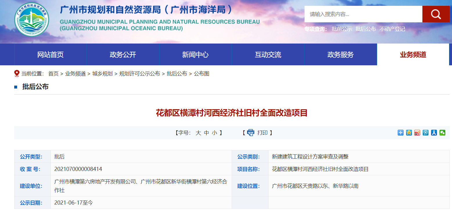 6月17日,广州市规划和自然资源局发布了花都区横潭村河西经济社旧村全面改造项目方案的批后公示。