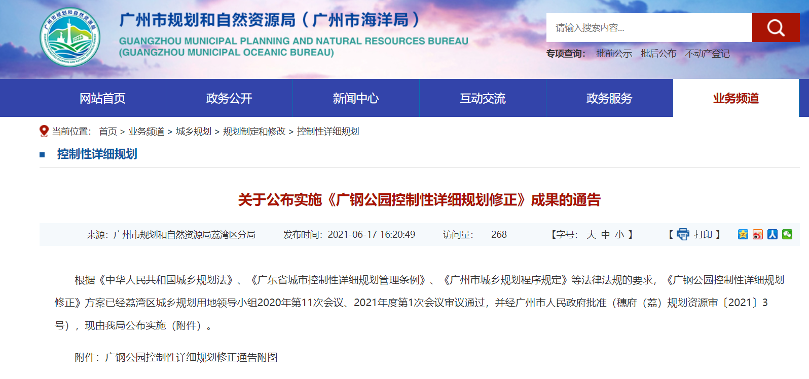 6月17日,广州市规划和自然资源局发布了关于实施《广钢公园控制性详细规划修正》成果的通告。