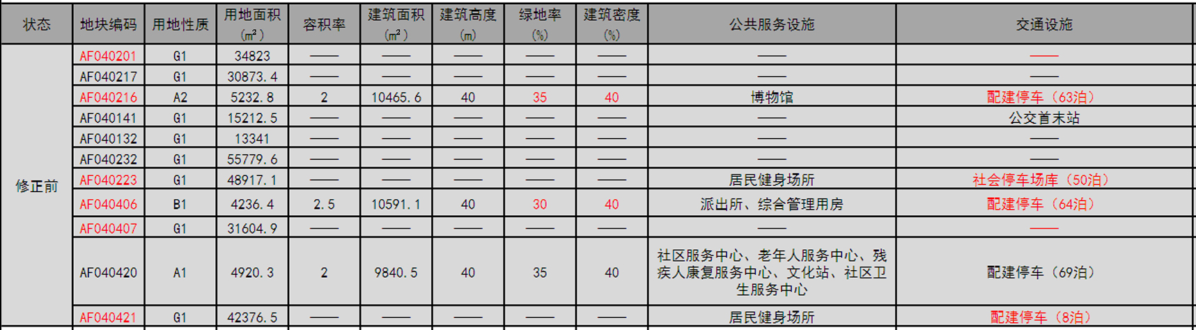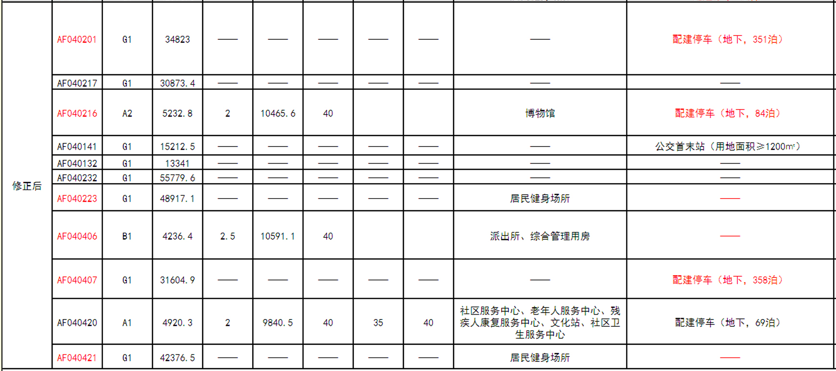 (一)修正文化设施用地地块(AF040216)、商业用地地块(AF040406)的用地界线,建筑密度,绿地率,修正后各地块用地面积、容积率和建筑面积保持不变。