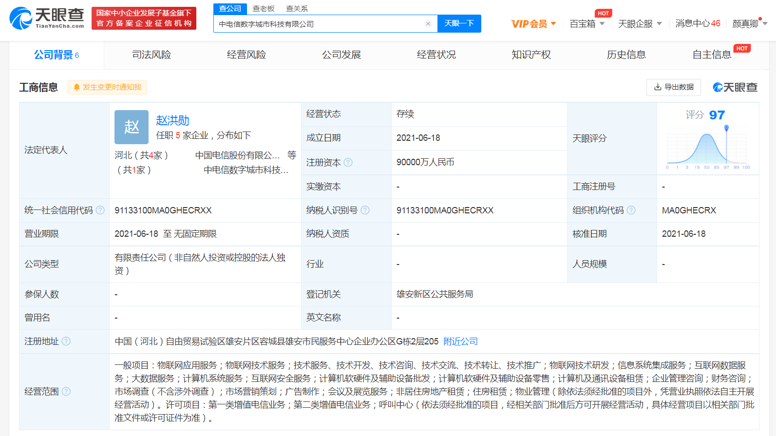 据天眼查APP显示,6月18日,中电信数字城市科技有限公司成立,法定代表人为赵洪勋,注册资本9亿人民币,经营范围包括物联网应用服务;信息系统集成服务;大数据服务;会议及展览服务;住房租赁等。 股东信息显示,该公司由中国电信股份有限公司100%控股。