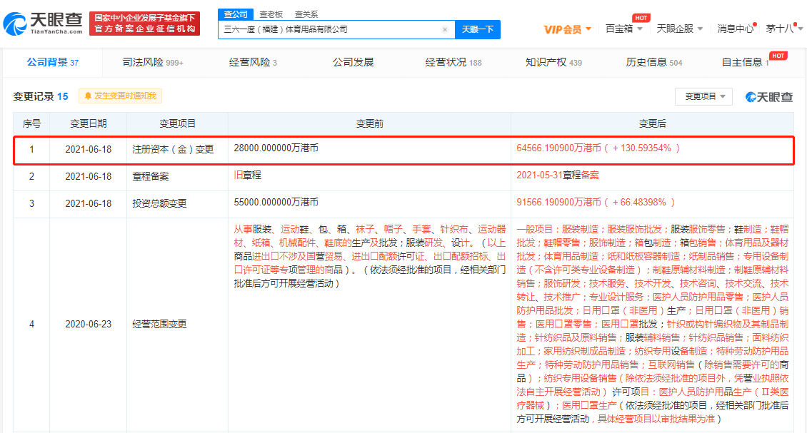 据天眼查APP显示,6月18日,三六一度(福建)体育用品有限公司发生工商变更,注册资本由2.8亿港币增至约6.5亿港币,增幅超130%。