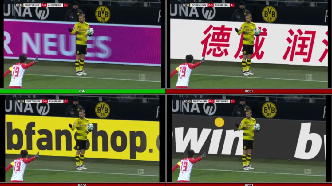通过在数字广告版上,为不同区域市场电视观众展示不同的广告内容,虚拟广告帮助多特蒙德俱乐部扩展了新的广告合作伙伴。例如下图中,右上角的视频内容就是针对中国市场的中文广告展示: