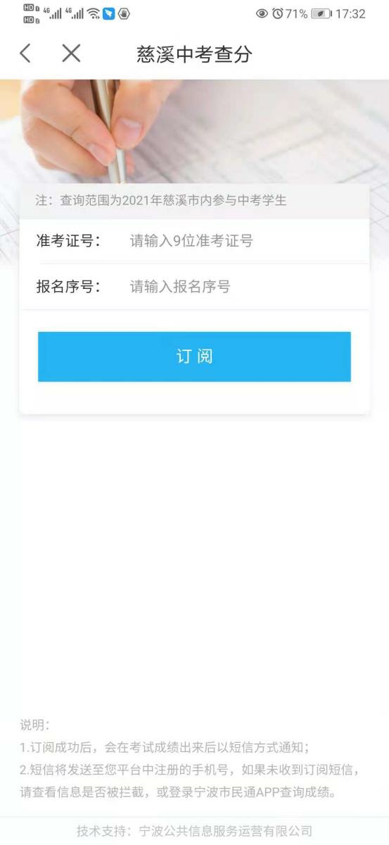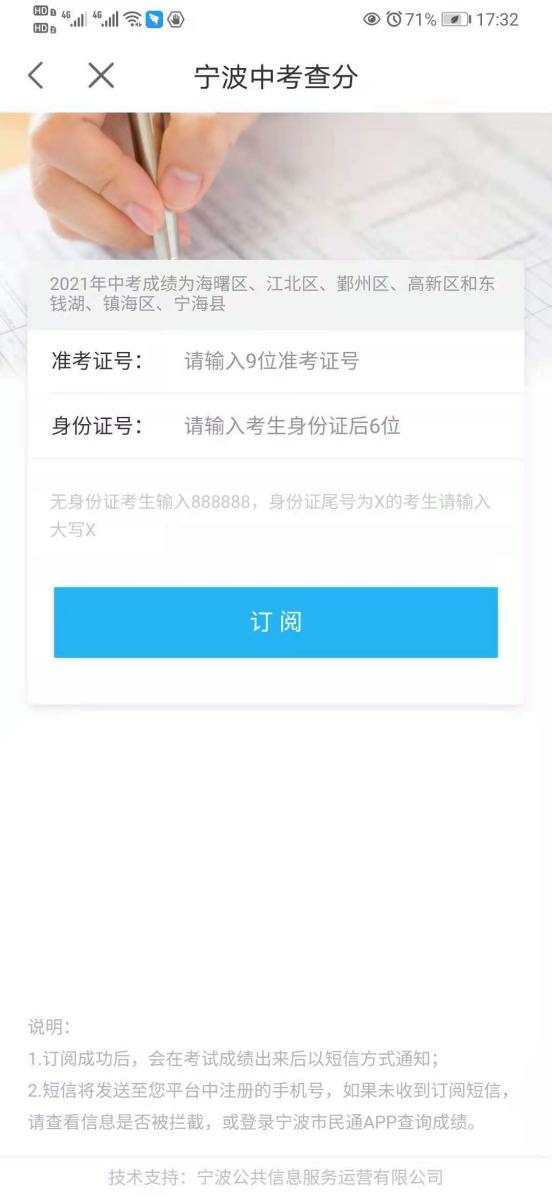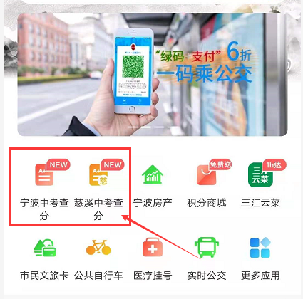 微信搜索公众号“宁波市民通NBPI”,在菜单栏中找到“宁波中考查分”或“慈溪中考查分”按钮,点击后根据提示完成手机号码验证、身份证及准考证号(慈溪为报名序号)的填写并提交。系统显示订阅成功后,中考成绩公布时将会以短信方式将中考成绩发送到您的订阅手机。