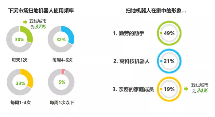 由于农村居住空间大,扫地机器人的使用频率并不低。艾瑞咨询《2021年中国下沉市场扫地机器人消费行为报告》显示,37%的五线城市用户每天使用1次扫地机器人,频率高于整个下沉市场的平均水平。