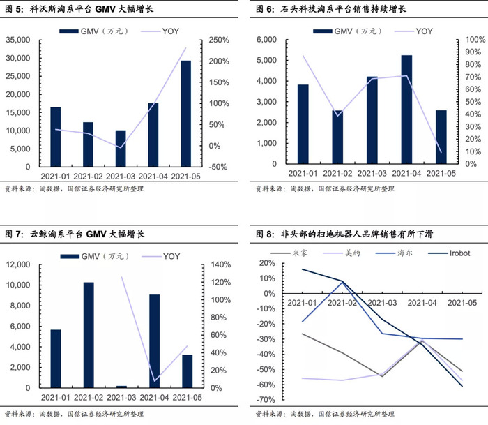 国信证券统计数据显示,今年1 5月,科沃斯、石头科技、云鲸等专业扫地机器人公司GMV同比增长均超50%,但美的扫地机器人却下滑53%,海尔则下滑22%。