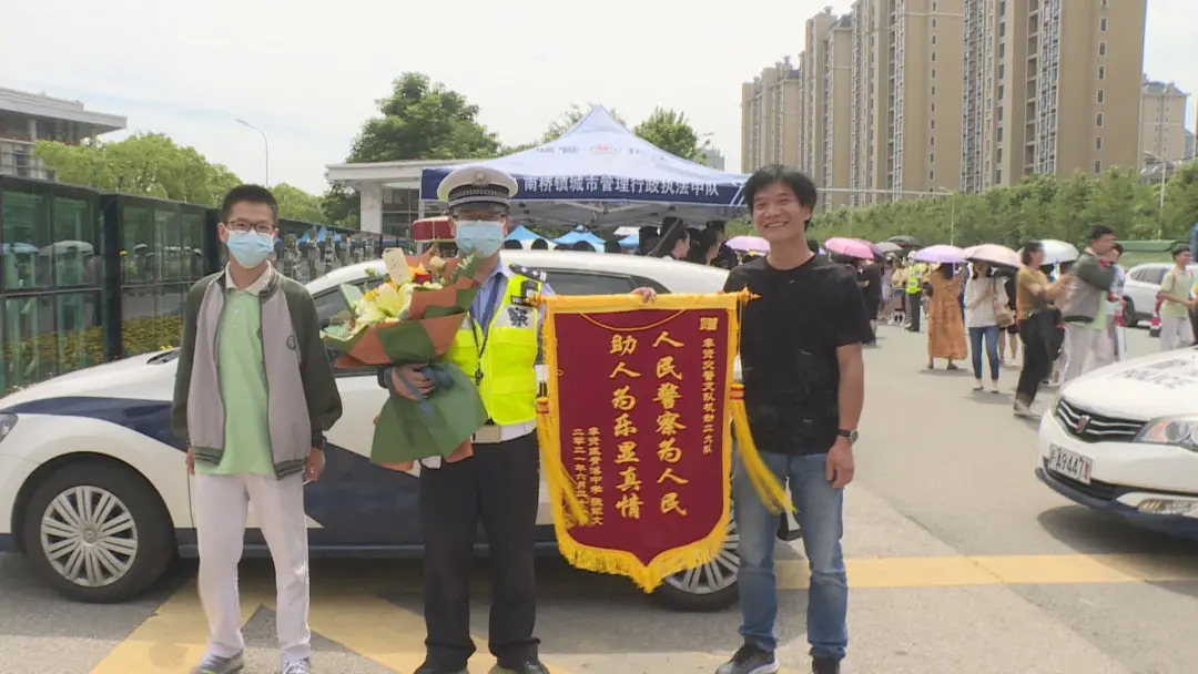 上午9点40分左右,随着最后一门科目考试结束,初三考生陆陆续续走出考场,其中,一名姓张的同学背着书包来到一名警察叔叔身旁,他的家长把早已准备好的鲜花和锦旗送上前去。原来,就在昨天下午数学科目开考前,发生了惊险的一幕。