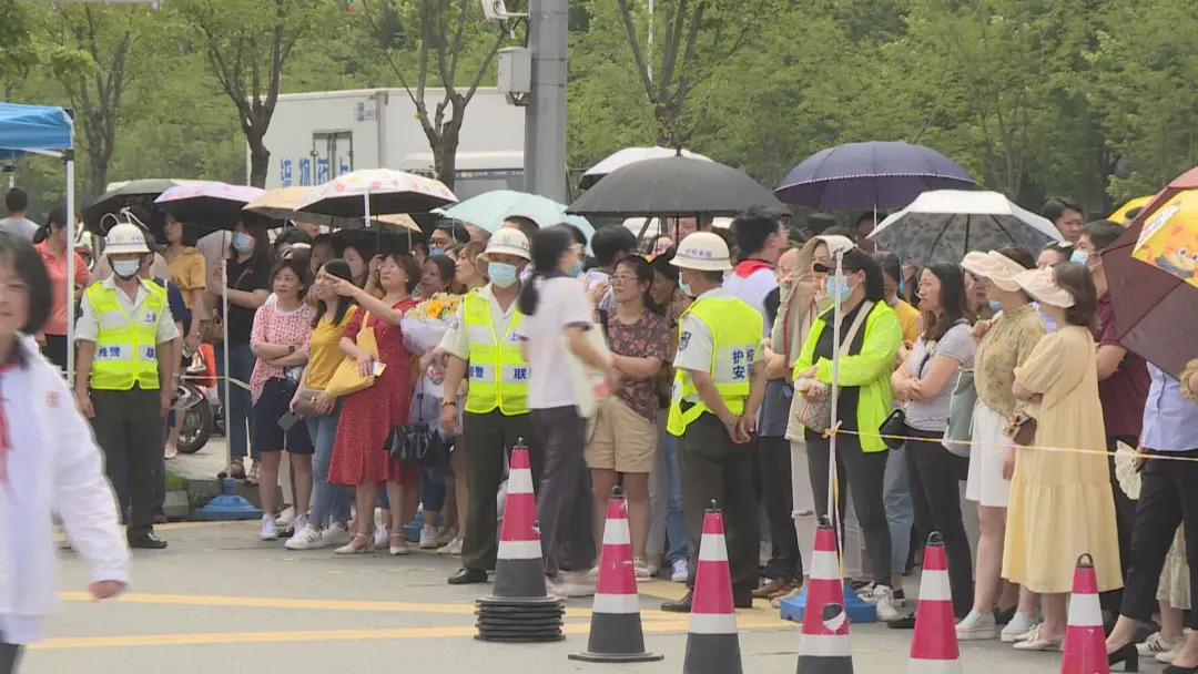 为了表示感谢,所以今天考试结束后,这位考生为警察叔叔送上了鲜花和锦旗。