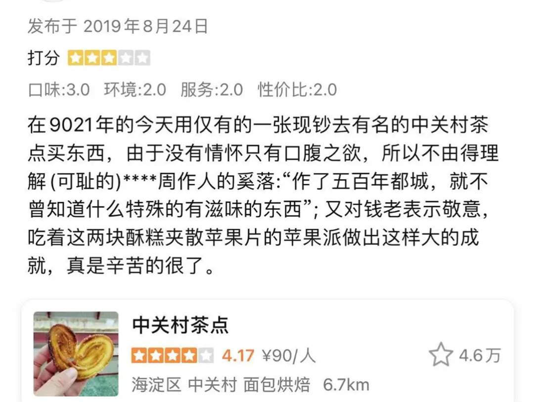 在大众点评上,不管老字号的人气有多牛,星级有多高,历史多悠久,差评总是如影随形,“中关村茶点部”就有这么一条评论。
