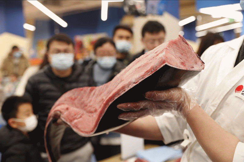 活鲜之外,店内还分设了冷冻水产品和冰鲜水产品,包括犬牙鱼、老虎虾、海鳌虾、马鲛鱼、扇贝、生蚝、蟹、三文鱼等。值得一提的是,为了让人们安心,冷链产品周围会放一个二维码,扫描后即可查询商品产地、核酸证明等信息。