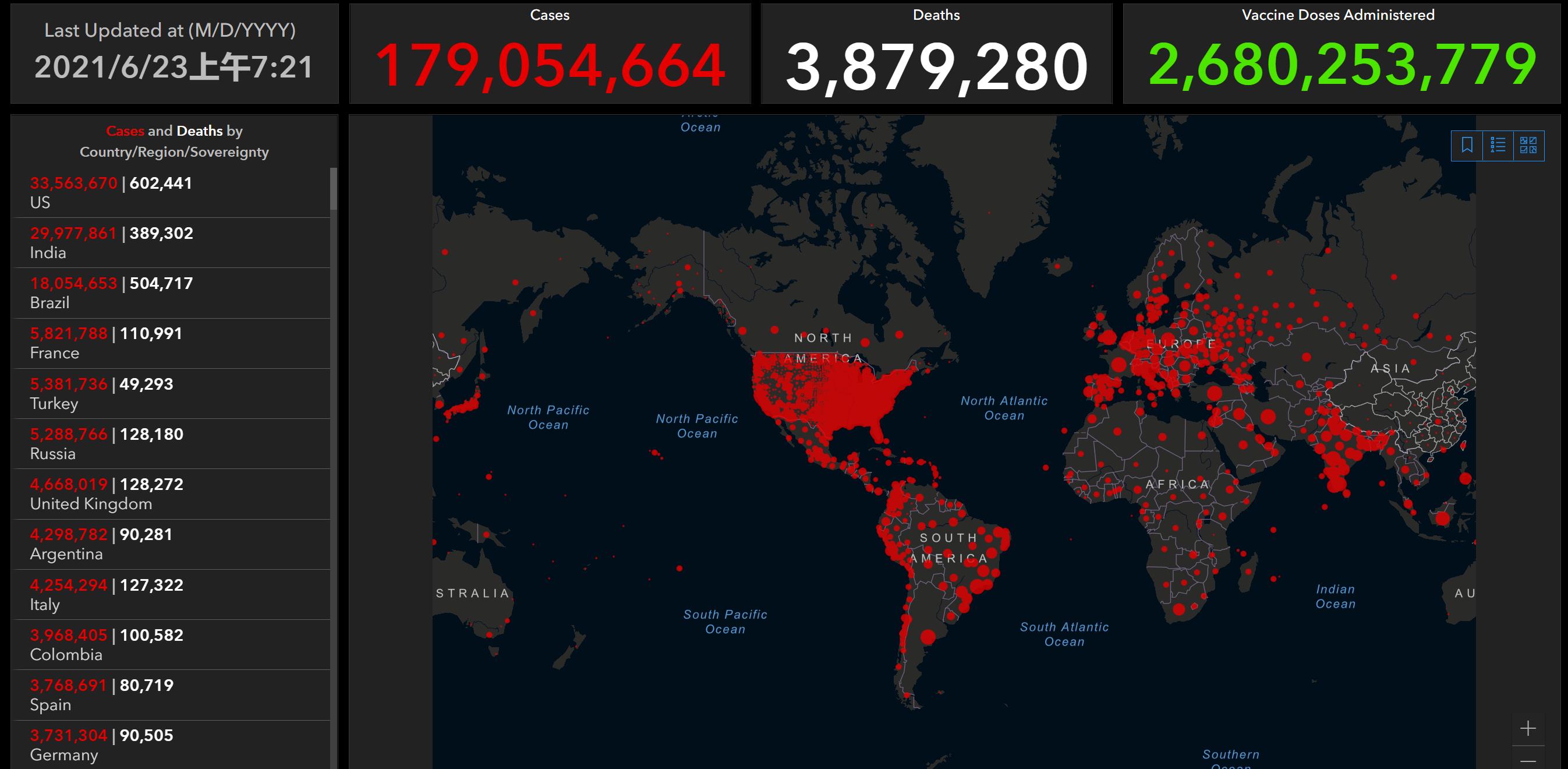 据约翰斯·霍普金斯大学的疫情追踪数据,截至北京时间6月23日上午8点,全球累计确诊新冠肺炎病例179054664例,累计死亡3879280例。