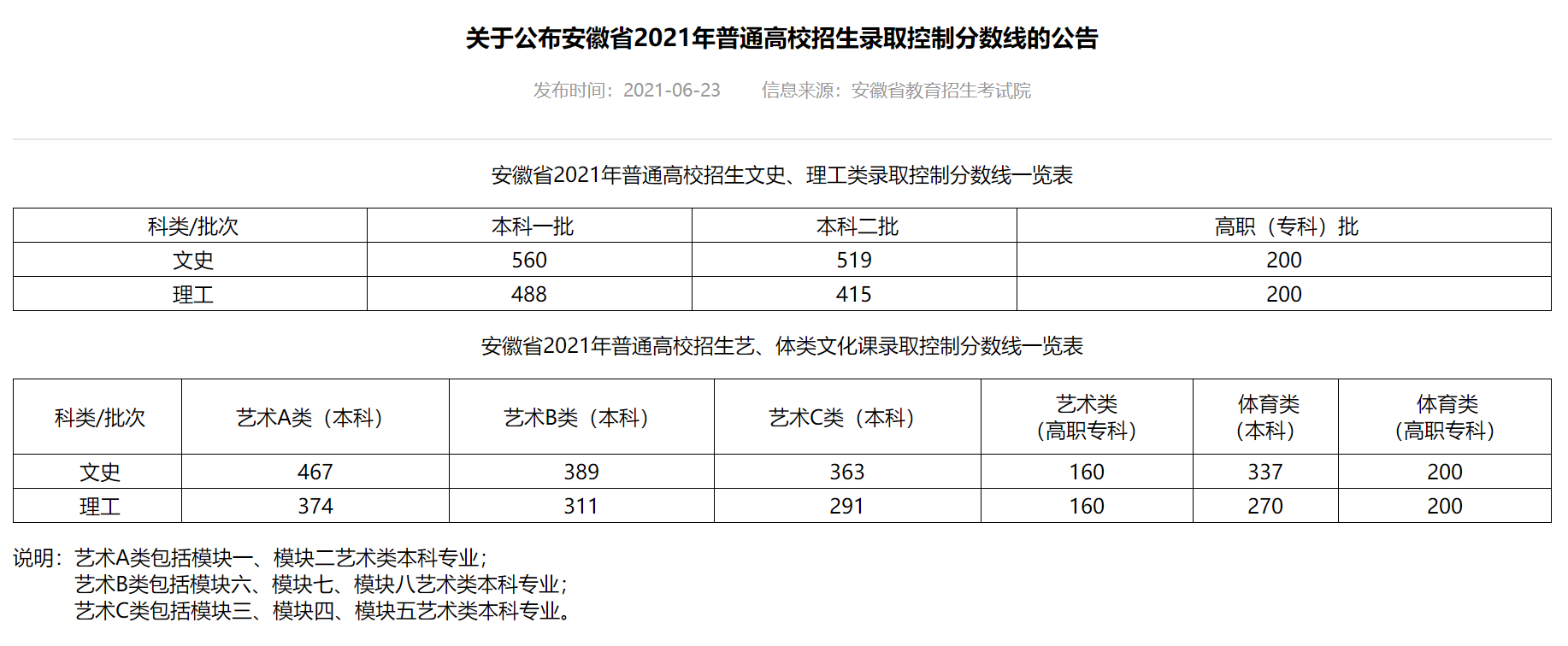 6月23日,安徽省教育招生考试院发布《关于公布安徽省2021年普通高校招生录取控制分数线的公告》。