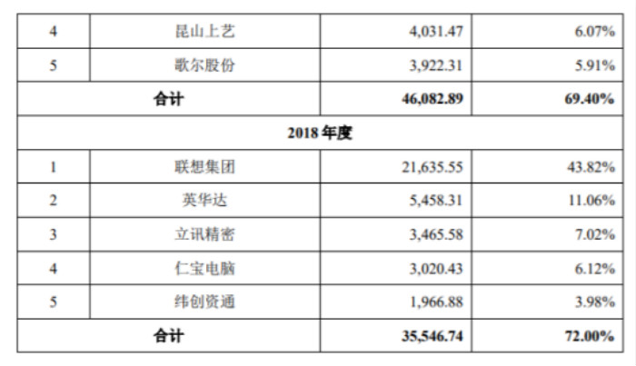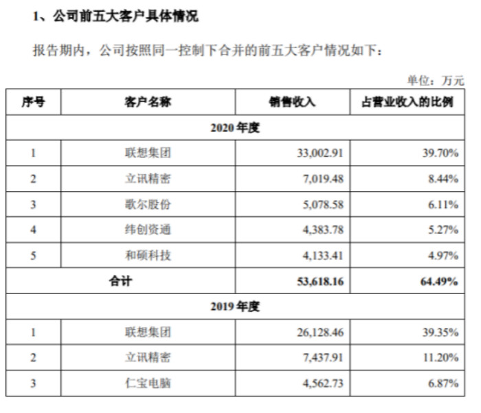 不难发现,公司的前五大客户阵容相对豪华,包括联想集团、立讯精密、歌尔股份(002241.SZ)、仁宝电脑等消费电子行业内知名公司。