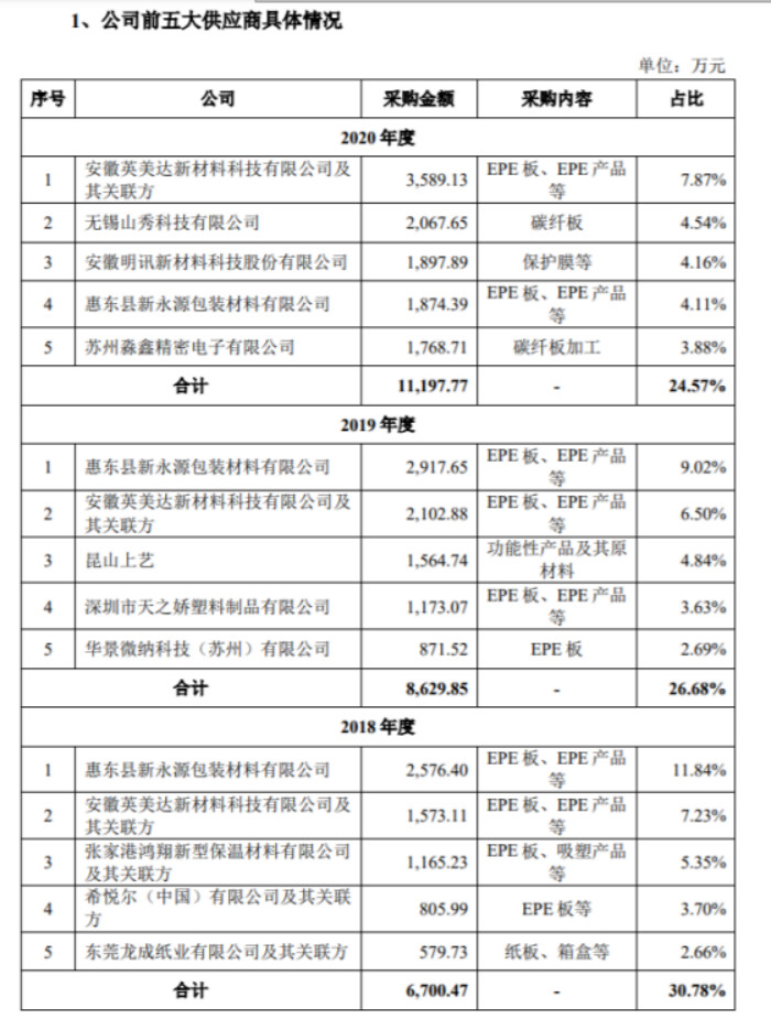 招股书显示,公司的原材料主要为EPE板、胶带、保护膜、碳纤维板等,报告期内,直接材料金额分别为1.30亿元、1.61亿元、2.21亿元,占公司自制产品成本的比例分别为63.07%、66.36%、64.87%,为经营成本的主要来源。