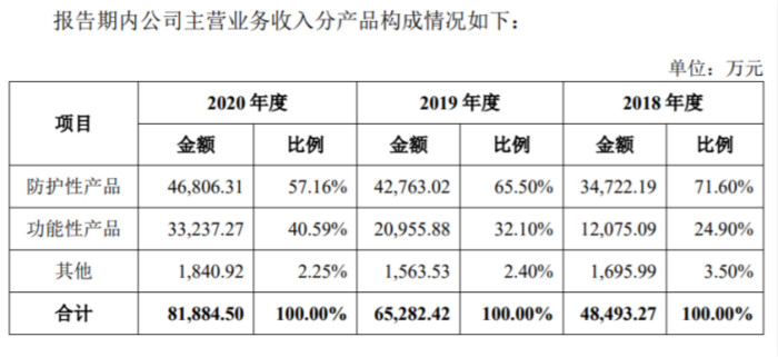 从功能性产品来看,其2020年毛利率下降为其毛利率贡献率下降的主要原因,尽管该产品收入占公司主营业务收入的比例由2019年的32.10%上升至2020年度40.59%,收入占比上升使其毛利率贡献率上升5.57个百分点,但是该产品的毛利率由65.63%下降至47.59%,毛利率下降使其毛利率贡献率下降7.32个百分点,合计冲抵之后该产品毛利率贡献率下降1.75个百分点。