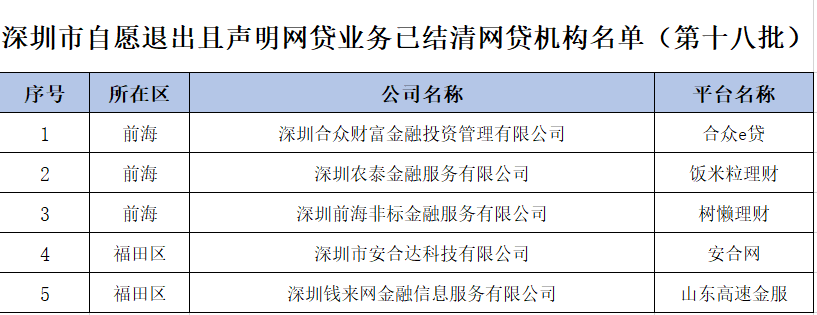 据深圳市地方金融监督管理局网站消息,6月23日,深圳市互联网金融风险专项整治工作领导小组办公室发布通知,公布了深圳市第十八批5家自愿退出且声明网贷业务已结清的网贷机构名单。