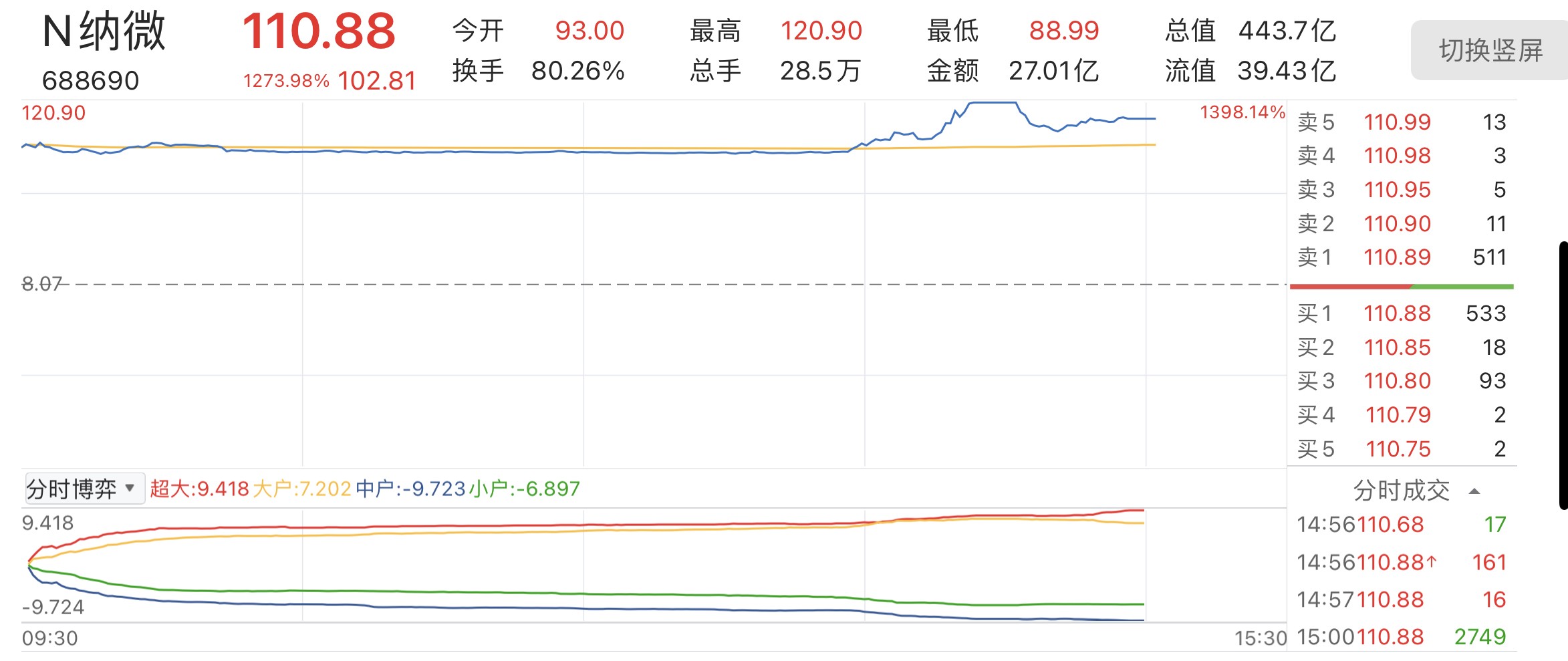 期间,纳微科技股价一度最高飙升至120.9元/股,涨幅达1398.14%;截至当日收盘,该股最终报收110.88元/股,涨1273.98%。据收盘价估算,纳微科技新股每签(500股)收益超过51000元。