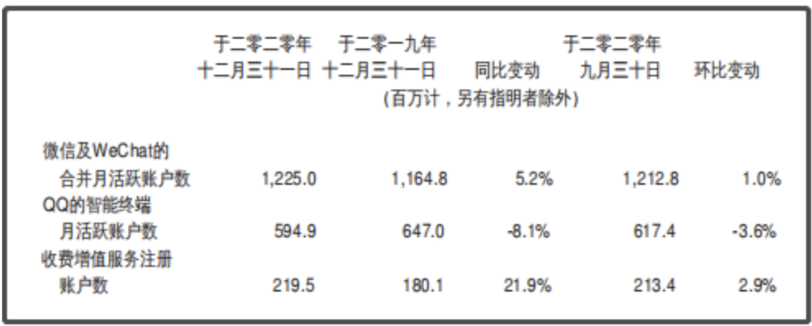 通信及社交方面,微信及WeChat合并月活跃账户数达12.25亿,同比增长5.2%,QQ智能终端月活跃账户数达5.95亿;微信每天超过1.2亿用户在朋友圈发表内容,3.6亿用户阅读公众号文章,4亿用户使用小程序。小程序及微信支付帮助中小企业及品牌加强与用户之间的联系,2020年通过小程序产生的交易额同比增长超过一倍。“视频号”的推出让品牌及企业扩大受众范围并促进交易。