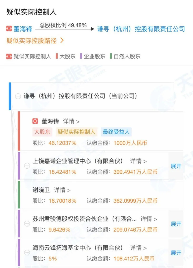 从成立时间来看,谦寻控股是一家年轻公司。企查查显示,谦寻(杭州)文化传媒有限公司成立于2017年4月,董海锋为大股东兼实控人,在公司任职董事长兼总经理。